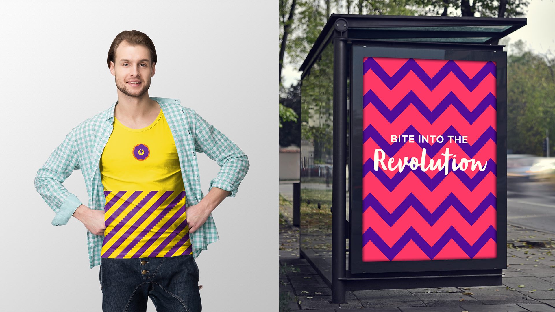 As you can see on two different brand treatments below, the pattern works like magic on the yellow and magenta backgrounds. The wavy pattern creates a lot of dynamic movement to brand posters and can be used effectively in advertisements.